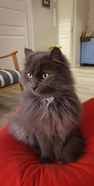 Stor, slank, grå langhåret med hvit flekk på halsen. Krøllete pels på magen. Gule øyne. 12 år, vant til å være ute. Chippet og kastrert. Selskpssyk, liker å få kos når han er ute. Har masse små hakker i ørene etter diverse møter med andre katter oppigjennom årene.