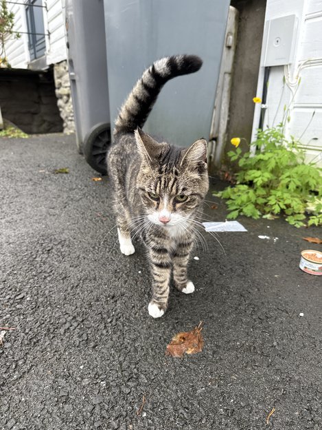 Veldig tynn katt, ser ut som den har mistet mye av tidligere vekt. Mjauet og var kontakt søkende