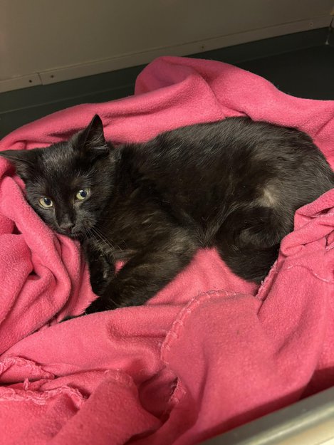 Kattungen er litt redd, og var tynn og beinete med oppblåst mage ved inntak. Vi antar at han er ca. 4 måneder gammel.