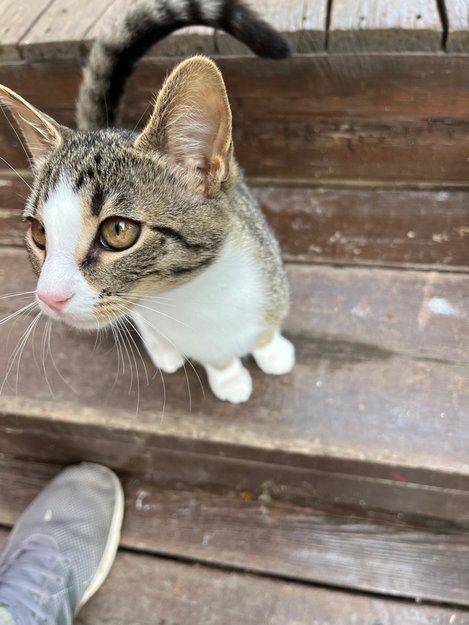 Hun er hvit på potene. Har noen få flekker av oransj, men er i hovedsak hvit og grå/brun i pelsen. Blekrosa snute.