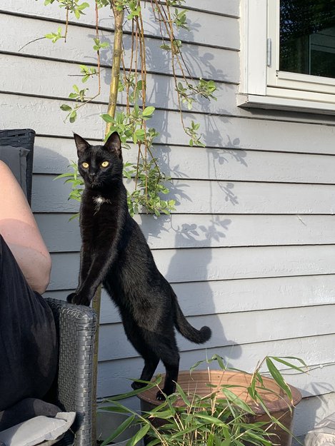 liten sort hannkatt med hvit flekk på brystet, spisse ører og gule øyne. Energisk men skvetten for lyder og bråe bevegelser. lyder navnet edvard, veldig glad i godis og klatring i trær💗