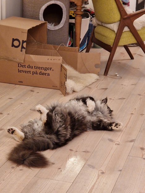 Stor hannkatt, Maine coon 2 år. Grå med sort ansikt og hvite poter.