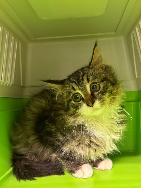 Denne hunnkattungen kom inn til oss fra ReMidt i Fillan på Hitra, hvor hun hadde blitt observert gående hjemløs ute. Hun er dessverre verken kastrert eller ID-merket.