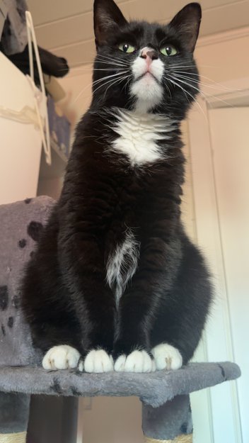 Han er chippet og kastrert. Han har hvite poter spesielt bak beina. Og har grønne øyner (kan se brune ut kommer an på lyset). Han har en skille på nesen der det er rosa og svart. (Kan hende at det rosa på nesen hans er hvit fordi det er så kaldt).