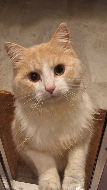 Lys krem hvit og lys orange, litt langhåret i pelsen, ung katt