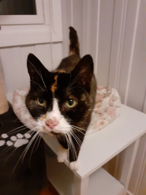 Eldre hunnkatt, sterilisert, men ikke chippet. Svært avmagret med en stor abscess på hode/pannen, gresstrå i nesa og mye øremidd. Veldig omgjengelig og kosete.