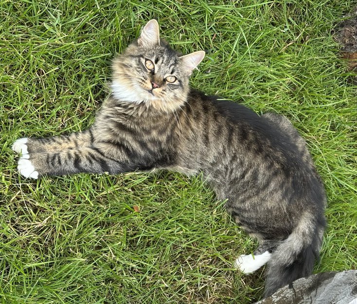 Utseende: Gråbrun stripet katt med hvite poter og hvitt brystparti. Lang pels, fluffy og stor hale. Store, grove poter.