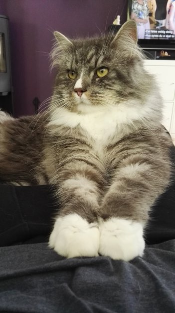 Per er en ganske stor skogskatt. Han er sky og redd for mennesker, men veldig snill. Han er barbert nederst på venstre labb, da han har hatt et sår på en tå. Han er chippet.