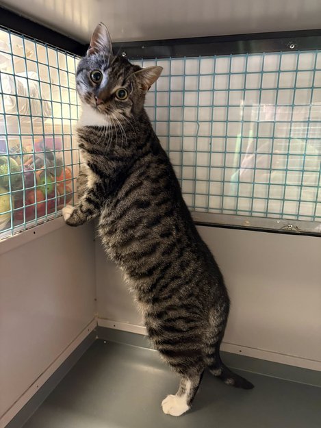 Denne hannkatten kom inn til oss fra Daløya på Frøya, hvor han hadde blitt observert gående hjemløs ute og er antatt avkom etter en katt som har gått ute over lengre tid. Han er dessverre verken kastrert eller ID-merket.