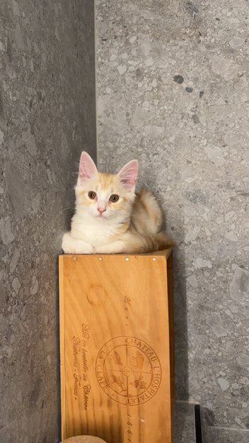 Helt hvit pels under , fortsatt kattunge, bare 4,5 mnd. Ganske lys i pelsen ellers men også mye brunt/rødt på ryggen. Labbene er hvite