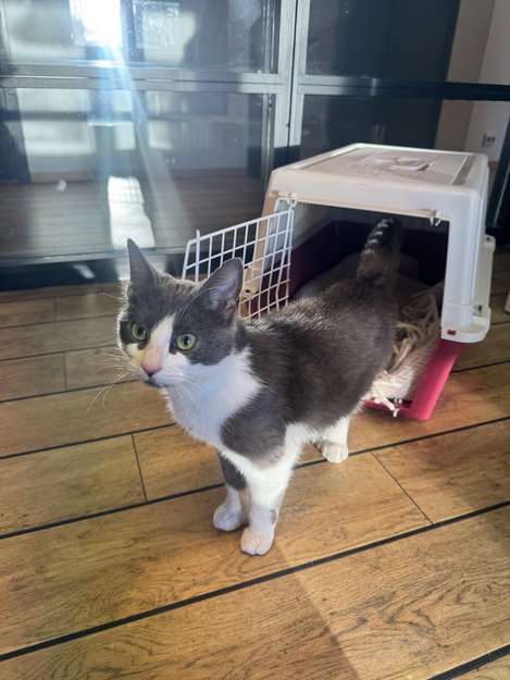 Katten har blitt sjekket hos veterinær. Ingen chip funnet og heller ikke tegn til sterilisering. Katten anslås å være hunnkatt på ca. 7-8 mnder.