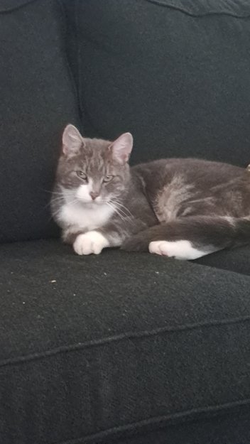 Grå og hvit, har noen beige hår under magen mot/ på labbene. Litt makrell mønster i ansiktet, halve leppen er hvit, hvit på bryst og under magen, med hvite sokker/ strømper på labbene, ser man nøye kan man se antydning til litt striper på kroppen, men mest grå. Og lett antydning til striper på hale og labber. Men ved første øyekast ser han grå og hvit ut. Han heter Dash og er en pus som prater mye hvis han er trygg på deg. Mot fremmede er han avventende/sky, men kan observere deg på litt avstand. Beiner ikke avgårde med engang noen ser på han.