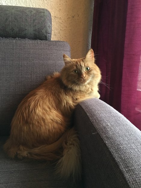 Sofus er en stor fin katt på nesten 6 kilo, med stor fin hale. Han er veldig kosete, og kommer når vi roper på ham.