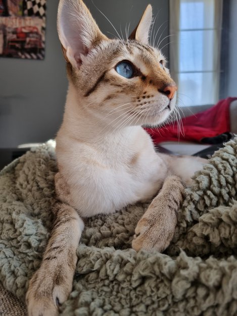 Blå øyne, skjegler, store ører. Han er en albino så han har lys pels.