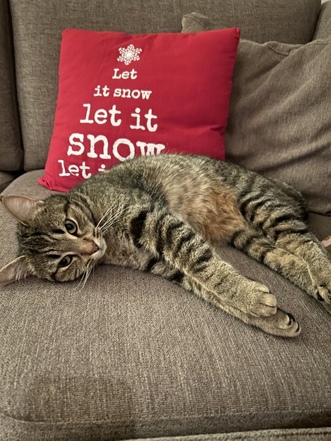 Mellomstor 4,5 år gammal katt. Gråbrun- og svartstripete mjuk pels. Lysebrun nedst på magen. Svart under potane. Små duskar på øyrene. Snill, vanlegvis kontaktsøkende men ikkje uttalt kosete.