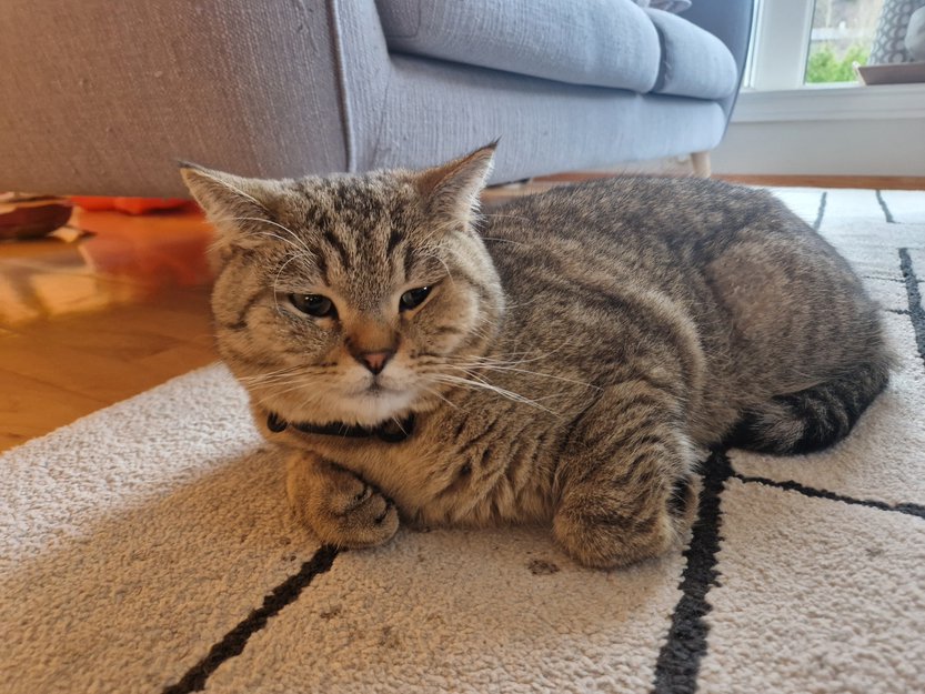 Funnet halsbånd med mye pels rundt. Har antakelig blir angrepet av en annen katt han pleier å sloss med. Finner han ikke igjen. Han pleier aldri å være borte lenge.