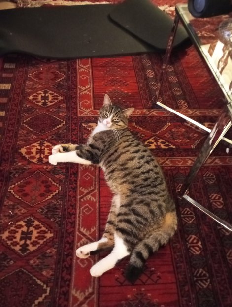 Naboen kom bort med en guttepus til oss i stormen i går. Hun lurte på om vi visste hvor den hørte hjemme da den prøver å gå inn til henne, men hun har to ho katter. Den har gått i området en stund men vi kjenner ikke til den. Den for inn døren til meg og la seg rett til rette i en stol og sov. Holdt den inne her i natt pga været. Vi er allergisk, så kan ikke holde den her. Er kjærlig og sosial - helt klart en huskatt
