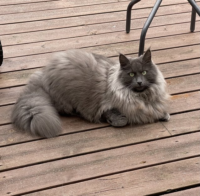 Pels i to grånyanser, veldig lang og myk. Vennlig, godmodig og pratsom katt.