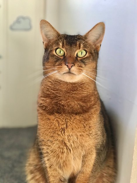 Halvt Abyssiner, grønne øyne og oransje/brun pels. Stor/litt tjukk katt.