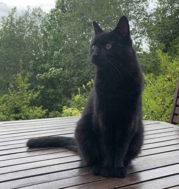 Han er helt svart, mellomlang pels og er ganske liten av seg. Gule øyne.