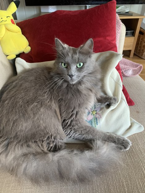 Langhåret, lysgrå, silkemyk, ensfarget hunnkatt i normal til slank kroppsform, 5,5 år gammel
