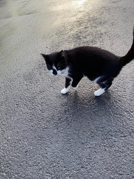 Svart katt med noe hvitt. Markert tegning i fjeset (se bilde)