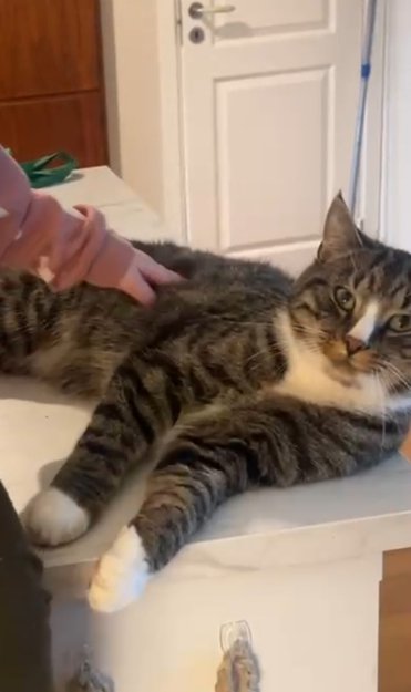Grå med svarte striper og hvite poter, hvitt bryst og hvit over nesen. Veldig sosial. Lyder delvis navnet sitt. Kan lokkes med godmat. Er chippet og registrert, men har ikke merke i øret.