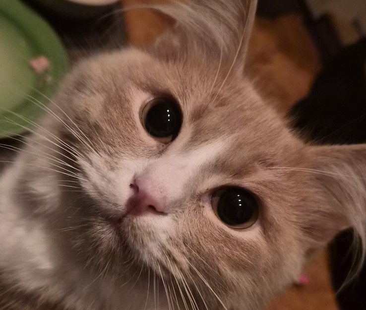 Lys oransje pels med litt hvitt. Oransje øyne og lang pels. Fluffy hale. Veldig rolig og snill, ikke redd for mennesker.