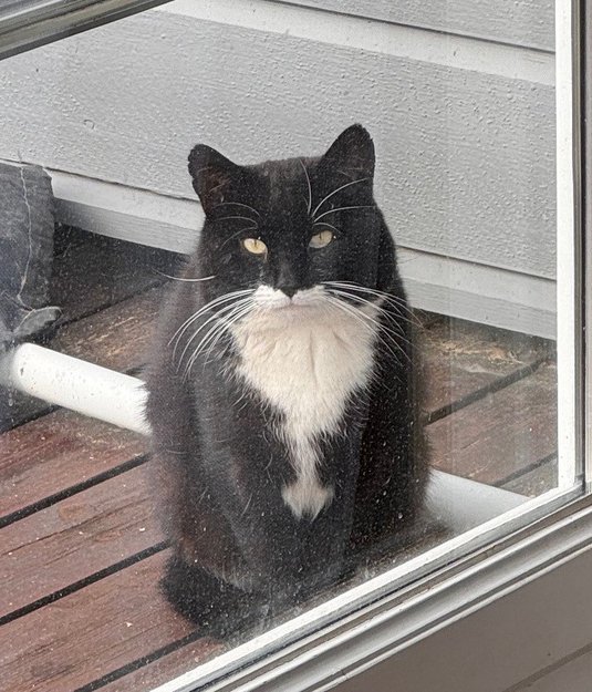 Vi har hatt besøk i hele vår og sommer av en Tuxedo-katt som har kommet inn og stjålet kattemat når verandadøren har stått åpen. Han sover jevnlig i utesofaen vår (under tak), og jeg er urolig for vinteren. Han ser fin ut i pelsen, men han er så sky at jeg ikke kommer i nærheten og får tak i ham for å sjekke chip eller helsetilstand forøvrig.