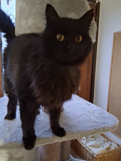 Sort semi langhåret, gule øyne, hakk i høyre øre