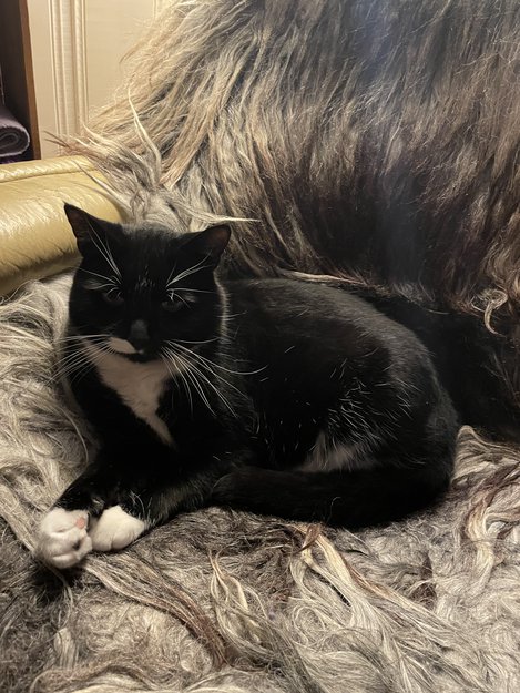 Svart katt, tydelig hvit «bart» kun på høyre side. Hvite poter og hvit mage. Veldig skvetten, så kan ha gjemt seg og er redd for å komme frem.