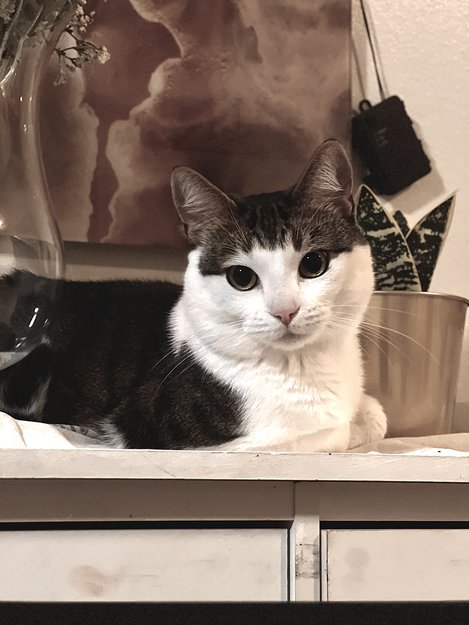 Katten er hvit på magen med brun/grå pels på ryggen.