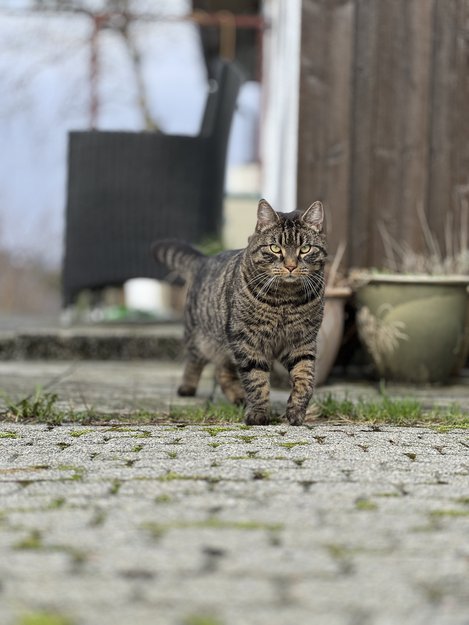 Stor katt. «Gaupeører». Logrer med halen, pratsom.