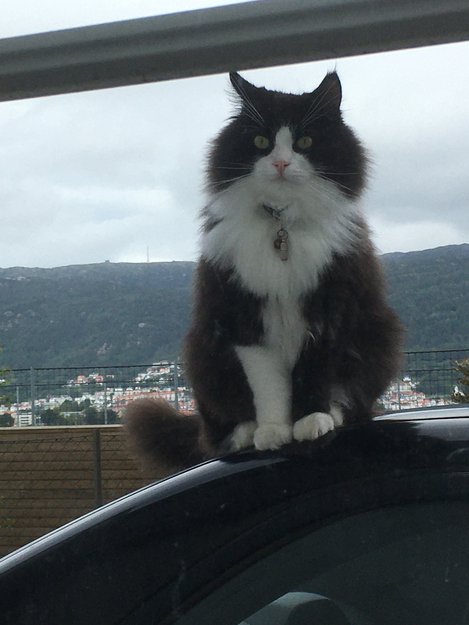 Svart oppå og hvit under. Går noen ganger med halen i krøll over ryggen. Alle potene er hvit. Er chippet og tatovert i øret.