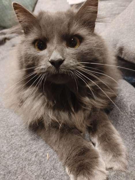 Helt grå, litt lysere sjatteringer på potene. Store poter, og stor for alderen. Hun er 1 1/2 år gammel.