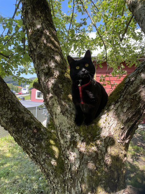 Helsvart liten katt av størrelse, med en liten hvit flekk på brystet.