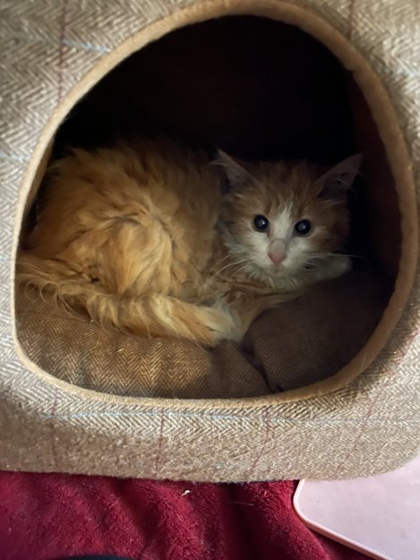 Innmelder melder til Kattebeskyttelsen om en sliten katt. Katten har nok vært ute en stund da den er veldig redd tynn, dehydrert og sulten.