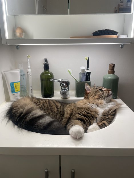 Han ligner på norske skogskatter. Har mellomlang pels og en veldig fluffy hale. Han har brune og svarte striper med hvite poter og hvit pels på halsen og magen.