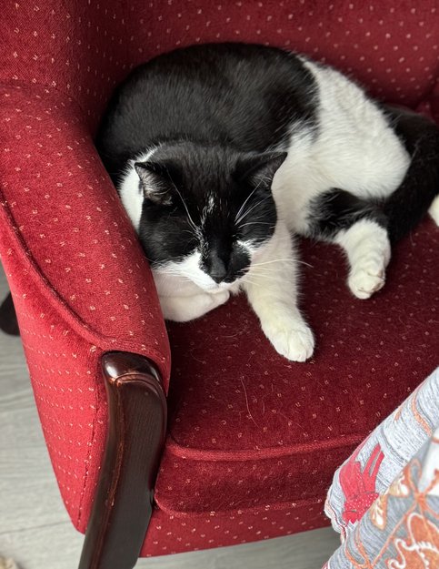 Katten er svart-hvit og er ganske stor. Han er ganske forsiktig og kan være skeptisk til ukjente mennesker.