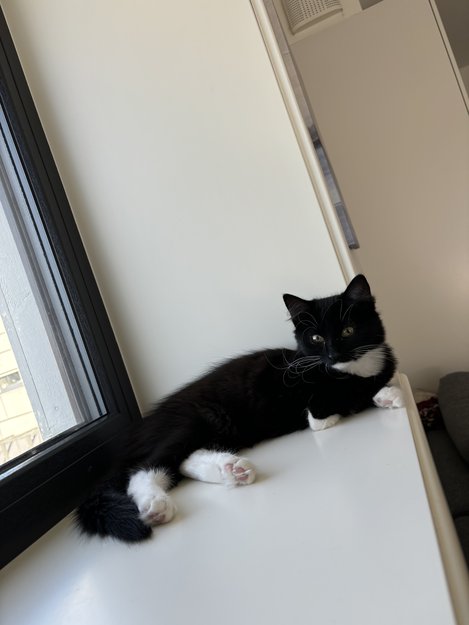 Hunkatt. Hun har svart pels men er hvit på halsen og på alle fire poter