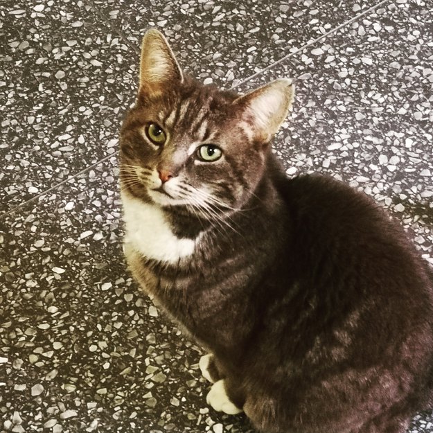 Han er hvit på brystet og hvite poter. Øynene er grønne.