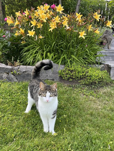 Har ikke kommet hjem. Er en litt sky og engstelig, men veldig snill katt. Pleier ikke å gå langt. Har et lite sår og er barbert ved halen.
