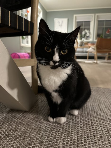4 år gammel sterilisert hunkatt. Svart med hvite poter, bryst, og nese. Gule øyne, mørk snute.