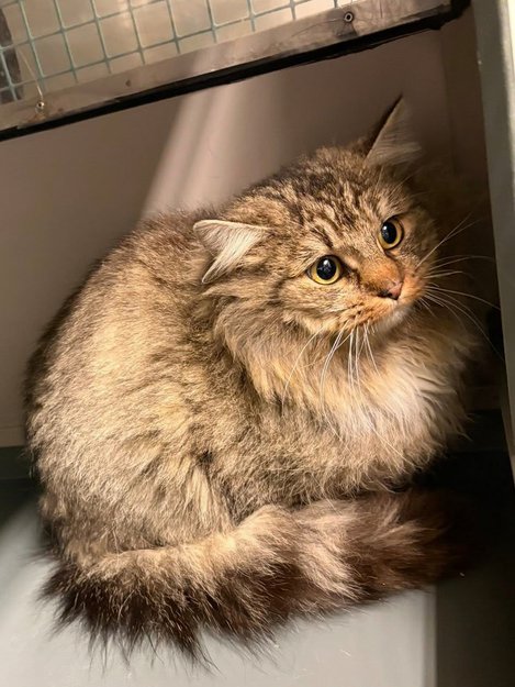 Katten er litt redd. Ved inntak hadde hun skitten og flokete pels. Vi antar at hun er ca. 6 måneder gammel.