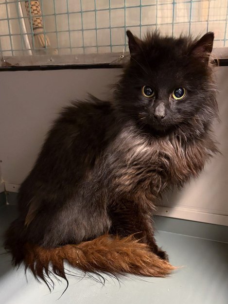 Katten er litt redd. Ved inntak hadde han skitten og flokete pels. Vi antar at han er ca. 6 måneder gammel.