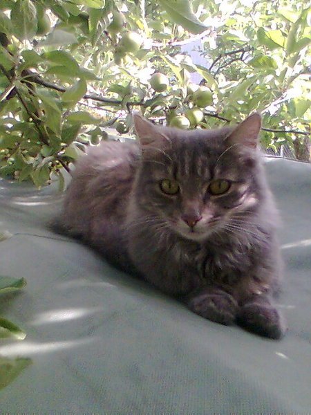 Grå semilanghåret hunkatt, ensfarget, men har lysere grå sjatteringer i ansiktet og under magen. Registrert som Omega, men kalles Tussa. Stille og forsiktig av seg. Ønsker gode/dårlige nyheter, godt å bare vite. Om noen har "adoptert" henne og begynt å mate henne, vennligst gi beskjed - vi finner en løsning..