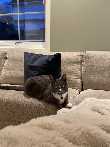 Ho er grå, med hvit mage opp til halsen, med en hvit stripe fra midt på panna ned til snuten. Har og en liten hvitt bart. Alle poter er hvite. Kan vere litt sky for fremmede, skvetter til høye lyder. Er ellers en koseklump når ho blir trygg på deg.