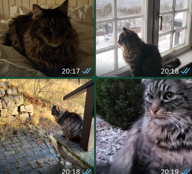 Vært ute siden i morges. Jeg har vært på jobb, kom hjem seint, ca. 18:15. Han pleier som regel å holde seg nær huset og dukke opp når jeg kommer hjem, men mulig han har søkt tilflukt et sted i dag.