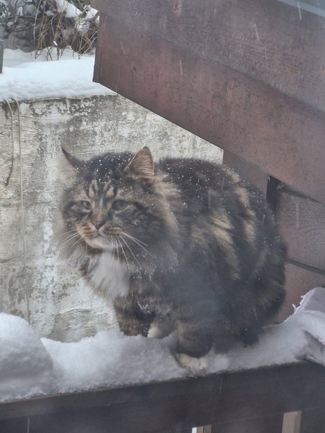 Katt ute i kulda! Den satt utenfor vårt vindu både i går og i dag. Og er også blitt observert utenfor vindu til en annen i samme område i høst/vinter. Vi har selv katt, noe som fører til mye skriking og uro, så har ikke hatt mulighet til å ta den inn.