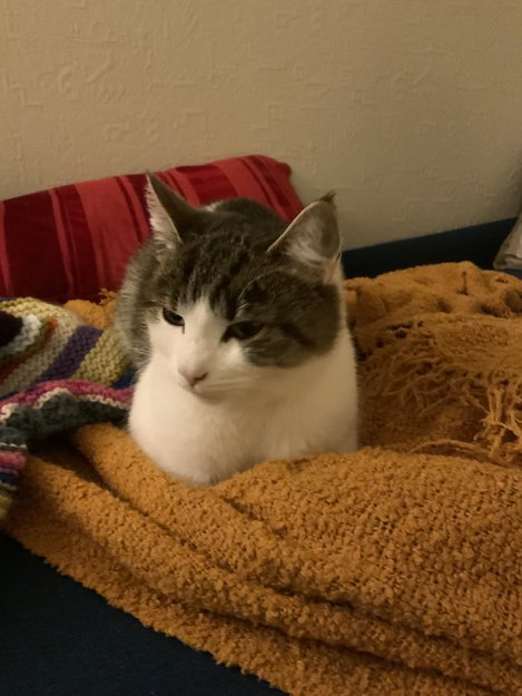 Vi har på dagtid prøvd å la hen ut, i håp om at hen finner vei hjem. Men katten kommer alltid tilbake kald, og litt panisk om å komme seg inn igjen. Hen har sovet her natt til i dag, da vi ikke kunne slippe den ut i så mange minusgrader.